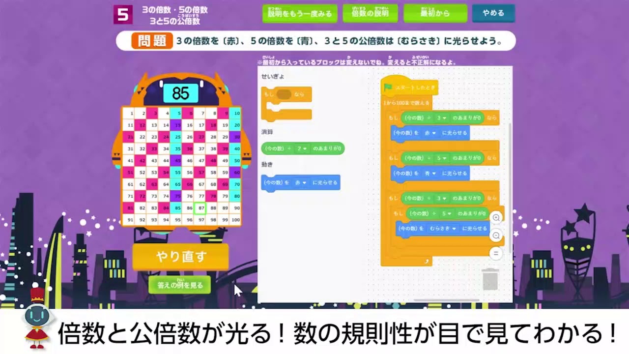 小学4年生では、理科の電気。小学5・6年生では倍数、公倍数を簡単なプログラミングをしながら学習!
